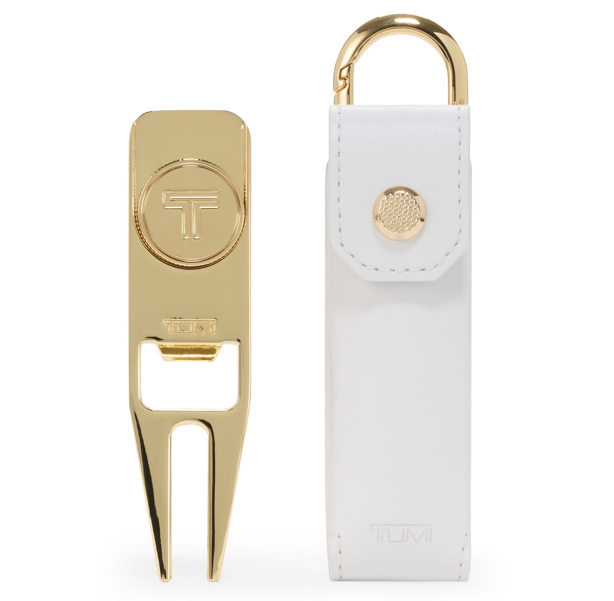 Everyone needs a divot tool to respect the turf and be ready for anything on the course. A perfect gift for the elevated golfer, this multi-use TUMI Golf Divot Tool is monogrammable and looks great in the available gold or gunmetal; plus, it can be attached to your belt, bag, or cart. It has a magnetic ball marker for claiming your spot on the green, an all-leather case in black or off-white, and a bottle opener for the 19th hole too.